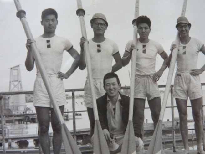 | 1年生のときは、ボート部員として練習には一応適当に参加していたのが、学年末の選手入れ替えで、私はナックルフォアーの対抗選手(本ちゃん)に組み込まれました。えらいことです。いろいろ言い訳をして断ろうとしました。生活費と学費を稼ぐためには、家庭教師のアルバイトを数軒かけ持ちしている。そのため練習開始時間に間に合わない。日曜日の午前中にはカトリック教会のミサに行く。高額な合宿費が払えない。などなど……。部長(鶴田文夫さん)は、「それでもかまわない」と言ってくれました。1年先輩の藤原潔さんは、合宿所の近所に住んでいて、リッチな農家のご子息でした。彼は私の合宿費をたびたび立て替えてくれました。私が寒い季節にまともなオーバーコートを着ていないのを見て、豪華なスペアのコートを貸してくれたりしました。それでも、春休みに合宿が始まると、私は合宿所(艇庫)に布団を運ぶのをグズグズ怠けて、結局、初日はドロンしてしました。高校時代の親友の1人である近間 章(こんま あきら)君が香川大学に行っていて、宮脇町に下宿したのを思い出して、そこへ転がり込みました。彼は快く私を泊めてくれて、高松市内を案内してくれました。2,3日お世話になりましたが、合宿所で私を待ちながら他のメンバーが練習しているのを思うと、「神様が許さない」と罪悪感を感じ始めました。それで結局は、3日ほど遅れて合宿インしました。対抗ナックルフォラーのメンバーは、コックス(C)が1年先輩の柴田浩志さん、整調(S)が坪田君、2番が私(大森)、3番が長森君、B(バウ)福田君でした。福田君は自称「バウの範ちゃん」で、われわれは「範ちゃん」と呼んでいました。彼もクリスチャンでしたがプロテスタントです。それでも、彼は日曜日に私ほど大騒ぎして教会へ行こうとはされず、淡々としていました。私は、ミサは欠かせないとしっかり宣伝して、必ず抜け出していました。長森君は顔が丸くて風船のようで、ニックネームは「フーセン」で、私は「アーメン」でした。 写真:初陣の朝日レガッタ会場(琵琶湖)にて、右から福田、長森、坪田、大森、真ん中に座っているのが柴田先輩。 私は大学生になると自宅を出て、家庭教師をしているおうちの一間を借りていました。そこは、繁華街千日前のど真ん中にある食堂で、従業員宿舎の一室でした。ご主人の孫娘(当時小学校6年生)の家庭教師も主にその部屋で行いました。隣室には、食堂で働く乙女(おばさんも)たちが寝起きしていました。当時の千日前は、岡山一の歓楽街で、飲食店や映画館が建ち並んでしました。私がお世話になった食堂は、千日前と西大寺町の交差点の角にあり、大繁盛している店でした。映画館はすぐ隣が岡山松竹、その向かいが日活。少し南へ行くと、白鳥座(大映専門館だったり洋画専門館だったり)、向かいが文化劇場(ここも大映になったり洋画になったりSY松竹文化となって松竹映画を上映したりしました)で、白鳥座の南は70ミリのテアトル岡山でした。現在はすべてなくなりました。映画館の間に何軒かパチンコ屋があって、夜も昼もそれはそれは賑やかでした。音に過敏な私がそのころは平気だったみたいです。夜、寝ていると、チーンジャラジャラ、軍艦マーチ、君が代行進曲、映画館の客寄せ放送、道行く人の話し声が響いてきます。今思うと、よくまあこんな環境で眠れたものだと思います。耳が過敏になったのは、その後生活が少し贅沢になったからでしょうか。 家庭教師は、その食堂の他に、隣の食堂の坊ちゃん(小学6年生)と、少し離れた寿司屋さんの姉妹をかけ持ちしていました。週に3回を曜日を違えて組んでいました。ときどき2軒かけ持ちになり、そのときはボートの練習が大幅に遅れました。大学の授業の後家庭教師、自転車で合宿所へ駆けつけると、他のクルーはすでに水上練習中なのに、私たちのクルーだけが岸辺で私の帰りを待っていました。謝る暇もなく、私の到着で一気に漕ぎ出します。誰ひとり不機嫌な顔をされませんでした。 合宿所の朝は大変です。トイレは汲み取り式のが1つあります。女子は別の農家の離れを借りて合宿所にしていますから、ここは男子だけです。それでも20人近くはいます。時にはトイレの順番待ちです。油断していると、下級生はタイミングを逃して、用を達せず、結局大学のトイレを使ったりします。下級生の私たちも工夫して、何とか朝食前に合宿所ですませるように、起床時間を他の部員よりも早める作戦をとりました。これはうまくいきました。まだ全員が寝静まっている超早朝に、そーっと起き出して、2階から下りて、台所の外にあるトイレ(こんなオシャレなものでなく「便所」)に入ります。同じ志の仲間が2,3人で順番を待ちます。今のようなトイレットペーパーはありません。新聞紙で後始末ができればマシで、ここでは週刊誌が1冊置いてありました。柔らかいページから先輩が破って使いますので、まともに順番待ちをしてい