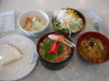 山盛りサラダ、冷ややっこ、味噌汁、カニ丼、チーズタルトで1400円也。